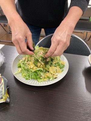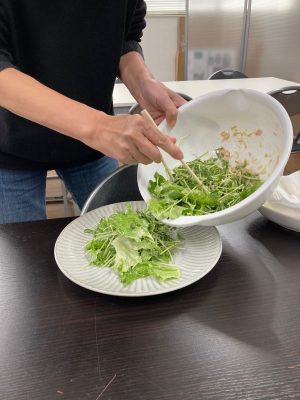 お昼時間に間に合わせるため、カレーを温めながらサラダ作りです。